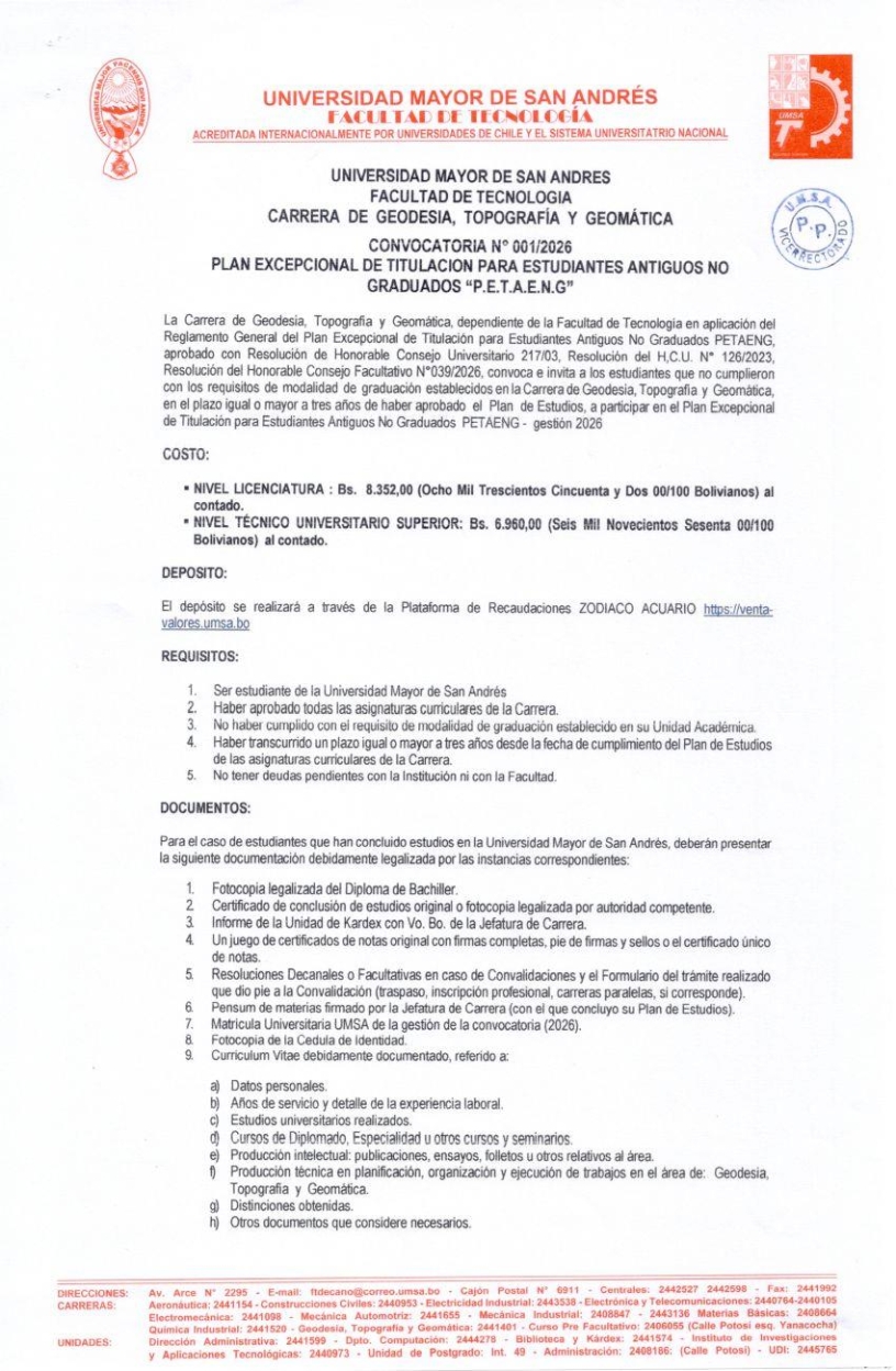 La Carrera de Geodesia, Topografía y Geomática, dependiente de la Facultad de Tecnología, convoca e invita a los estudiantes que no cumplieron con los requisitos de modalidad de graduación establecidos en la Carrera de Geodesia, Topografía y Geomática, en el plazo igual o mayor a tres años de haber aprobado el Plan de Estudios, a participar en el Plan Excepcional de Titulación para Estudiantes Antiguos No Graduados - PETAENG, Gestión 2026.