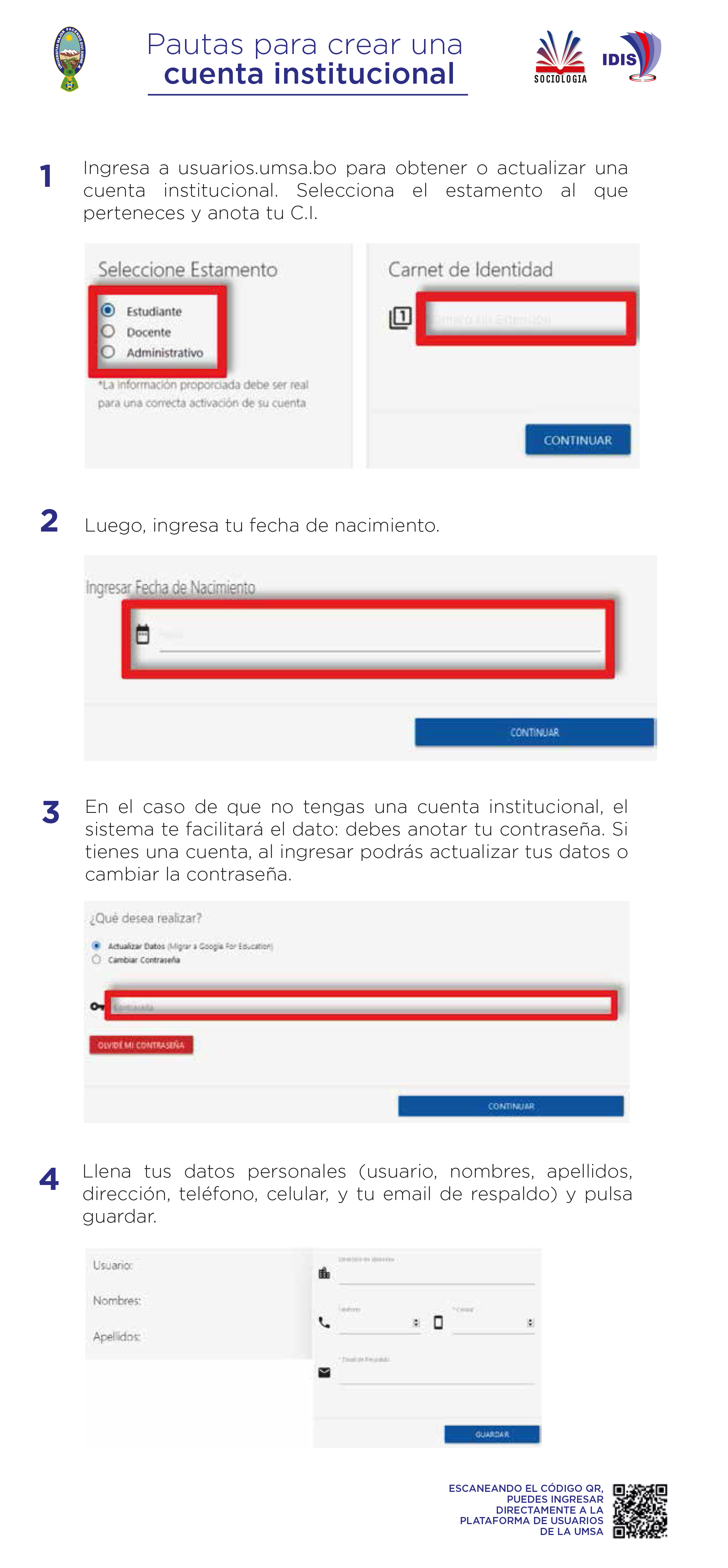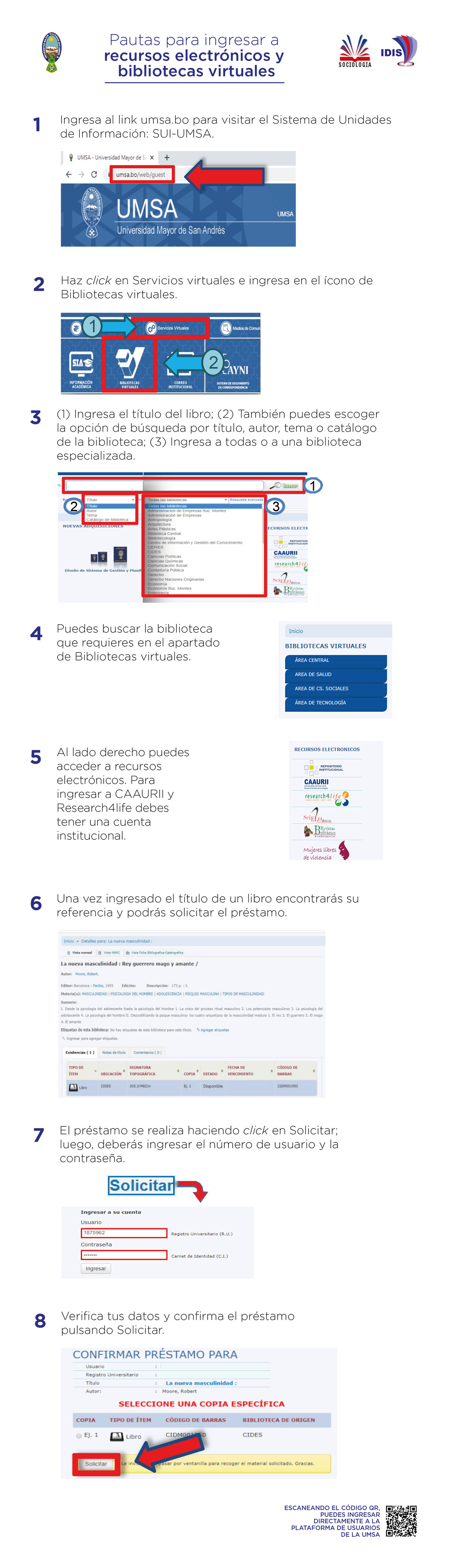 En este espacio, los usuarios de las bibliotecas de la Universidad Mayor de San Andrés podrán encontrar información útil para crear una cuenta institucional, ingresar al Repositorio de la UMSA y acceder a recursos electrónicos y bibliotecas virtuales de la universidad.